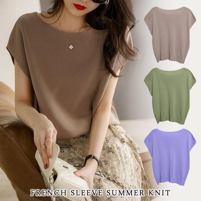 トップス レディース 春 サマーニット 無地 ベージュ カーキ パープル チュニック ボートネック ゆったり スリーブ 20代 30代 40代