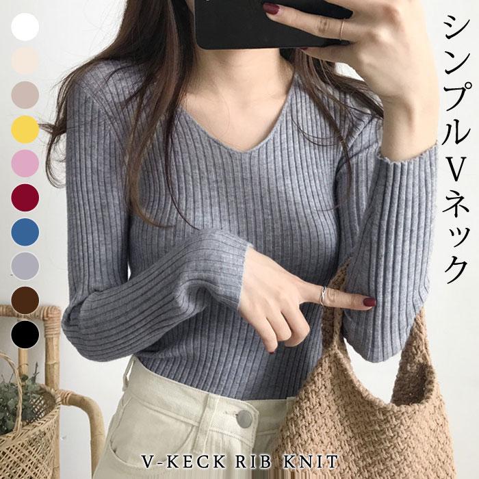 ニットトップス レディース 春 黒 白 ニット リブニット トップス Vネック セーター カジュアル ホワイト ブルー グレー ブラック Tシャツ カットソー