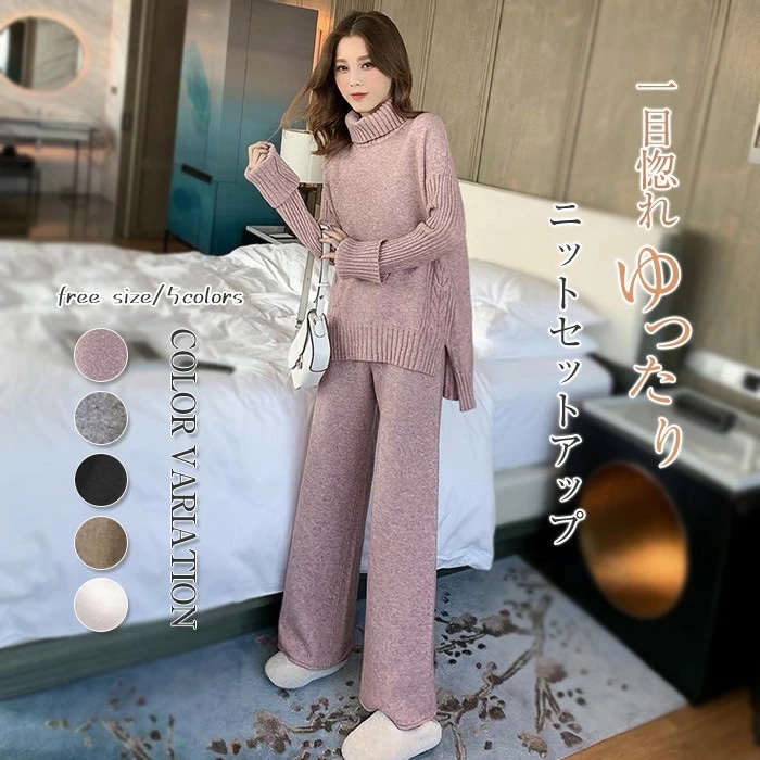 ニット セットアップ レディース セットアップ ニット 上下セット 2点セット パンツスーツ タートルネック ロング丈 プルオーバー ワイドルーズ 通勤 カジュアル シンプル 長袖 ゆったり リブニッ