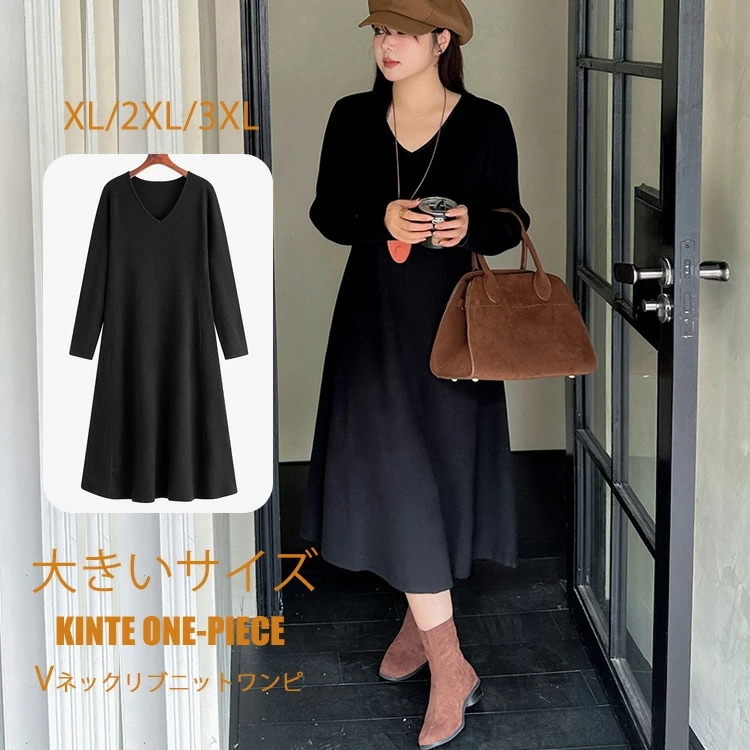 ニットワンピース レディース ワンピース ワンピ ニットワンピ ニット フレア ロング ロング丈 長袖 Vネック リブニット ゆったり 大きいサイズ 体型カバー Aライン 黒 ブラック ぼっちゃり 秋