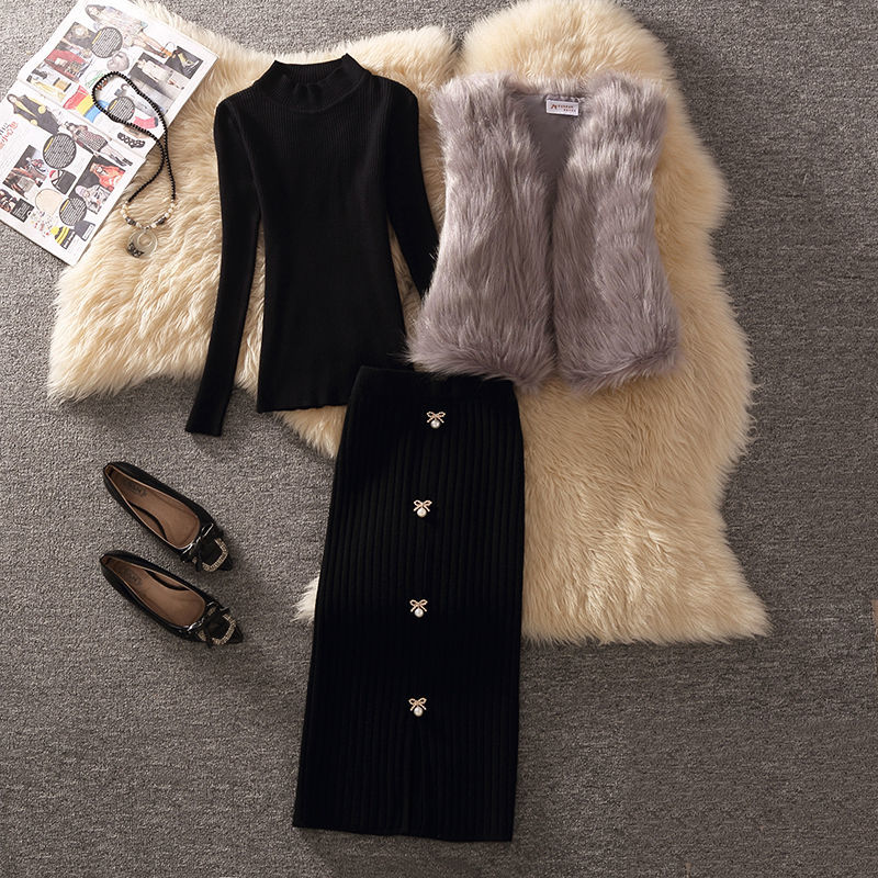 三点セット 秋 フェイクファー ベスト +ニット セーター+プリーツスカート 着痩せ セット セットアップ