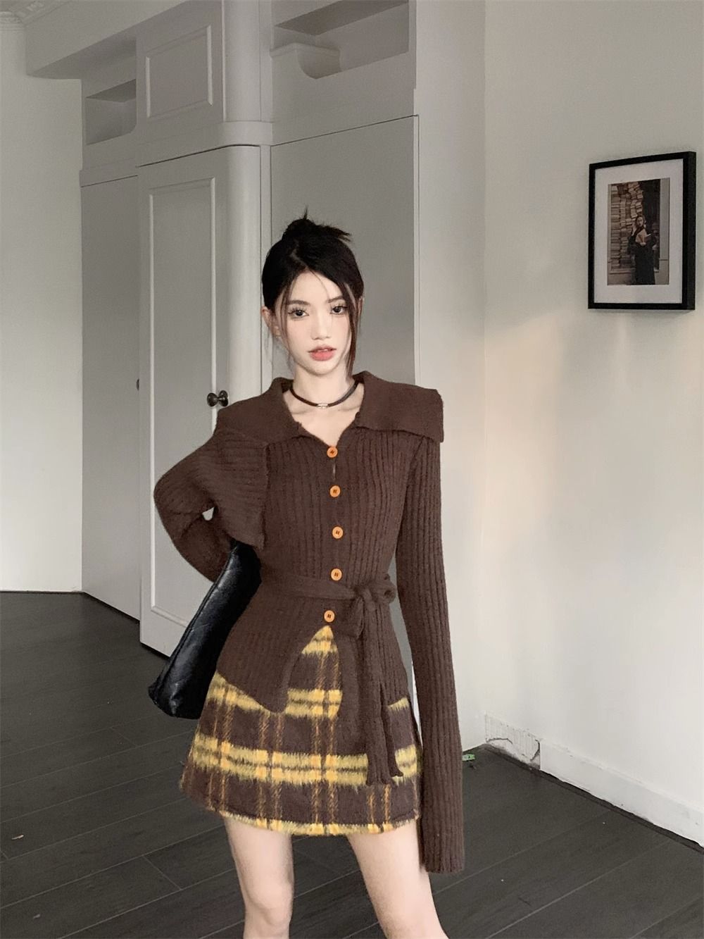 通勤スーツ 2024早秋 デザイン感 フレンチレトロ ニットカーディガン チェック柄スカート セットアップ 2点セット レディースファッション