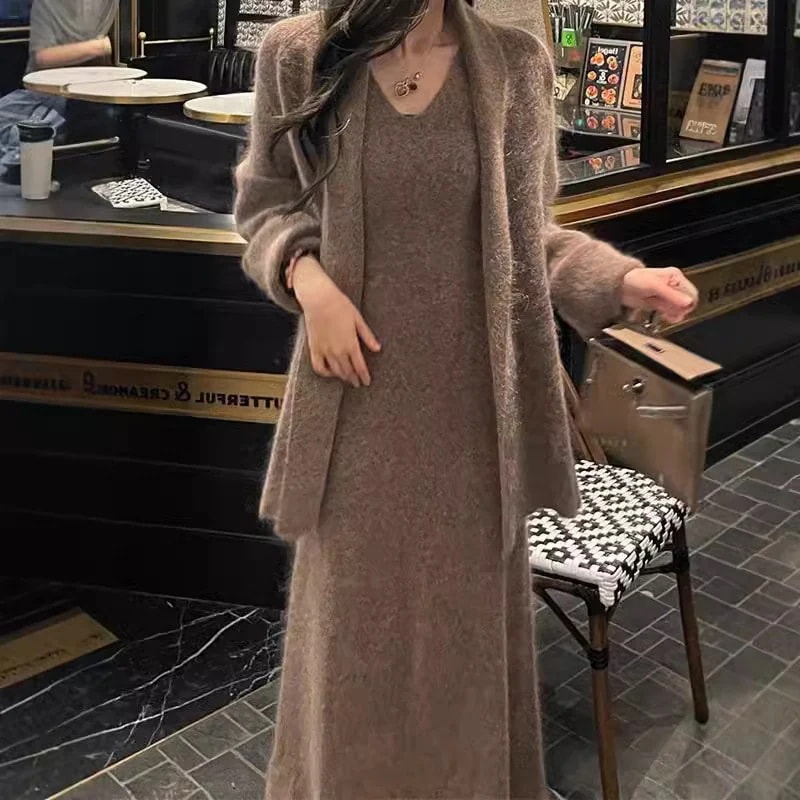 ワンピース 秋冬のおしゃれニットカーディガンジャケットワンピース2点セット女 ニットワンピ