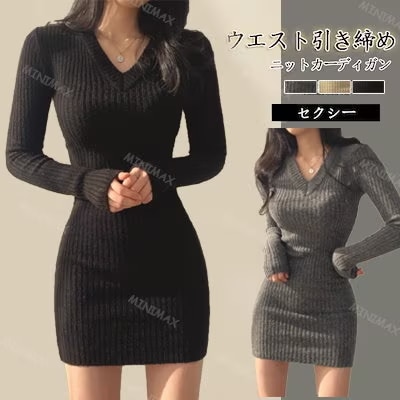秋冬 Vネック ニットワンピース シンプル おしゃれ ワンピース インナー ロング ワンピース セーター ウエスト引き締め ニットワンピ