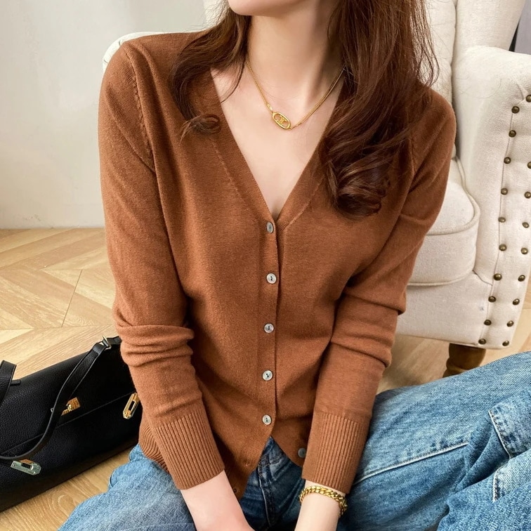 2024 春夏 カジュアル ニットカーディガン シャツ 無地 vネック カーディガンショート ルーズコートトップス レディース セーター ニットトップス
