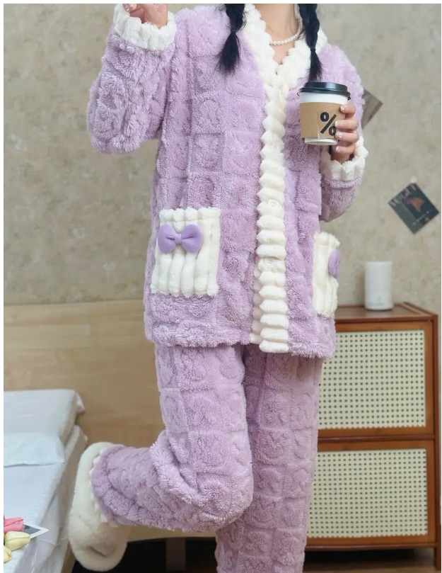 ティーン向けのキュートなポリエステルジャカードパジャマセット - Vネックニット生地リボンディテール暖かなコーラルフリースのバニー柄ラウンジウェアセット