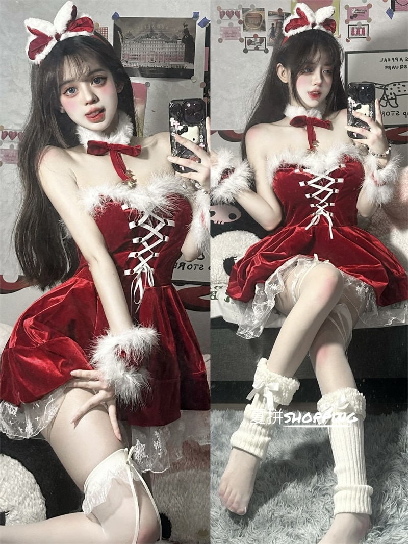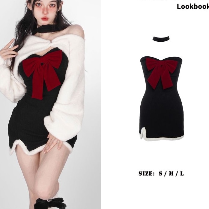 2024クリスマスブラックインナーワンピースリボンセレブセクシーギャル甘秋冬クリスマスキャミソールショートスカートコート女 クリスマス