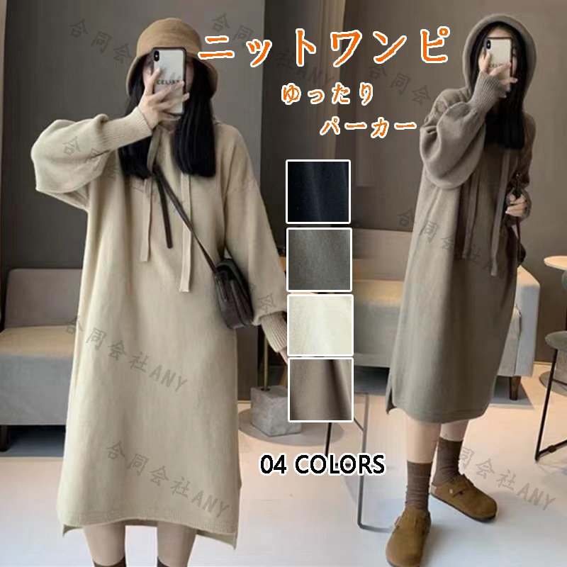 パーカー バックパール レディース 韓国 シンプル 秋冬 フード付き チュニック プルオーバー ニット