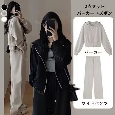 2点セット トップス+ズボン パーカー スウェット ア ップ 長袖フード付きアウター無地 スウェットパンツ韓国ファッション レディース