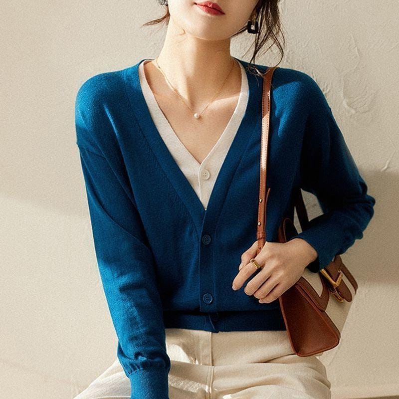 カーディガン レディース 春コーデ ニットカーディガン 長袖 春服 ニットセーター vネック フェイクレイヤード 重ね風 秋冬 春 ショート丈 開襟
