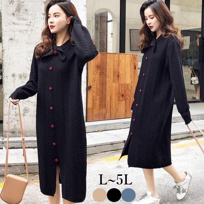 リボンタイニットワンピースリボンタイワンピースリブワンピースニットセーター ロングワンピースミディアム丈 春秋冬 長袖 大きめ大きいサイズゆったり体型カバー 無地