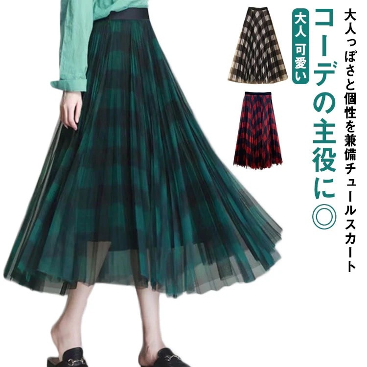 ロングスカート チェック柄 スカート チェック チェックチュールスカート チュールスカート マキシスカート お出かけ プリーツスカート ウエストゴム 春 秋 フレアスカート フレア スカート レディー
