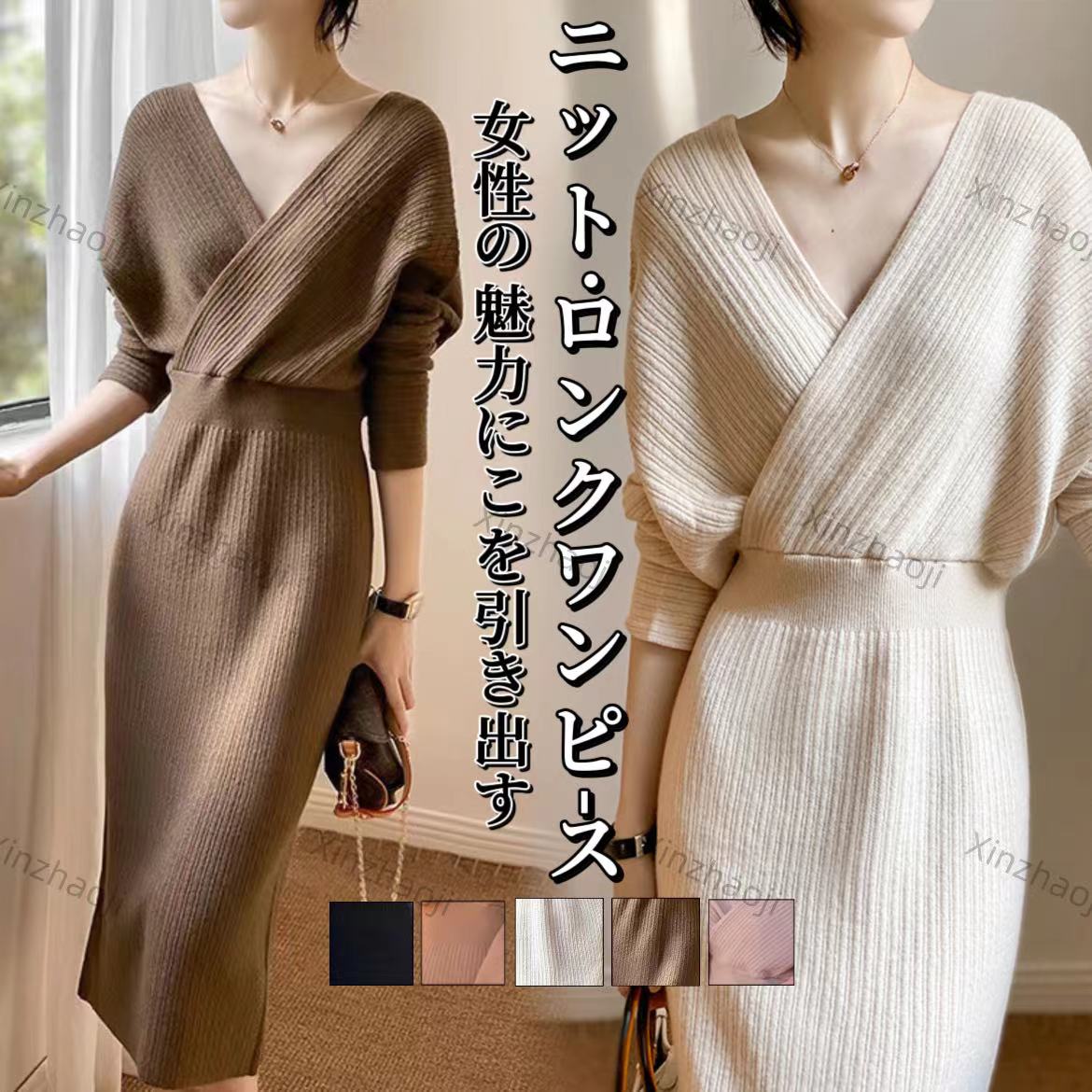 新作 おしゃれ 気質 ワンピース Vネック 長袖 ウエスト引き締め ニットワンピース 通勤 ロングワンピース 大きめサイズ ニットワンピ