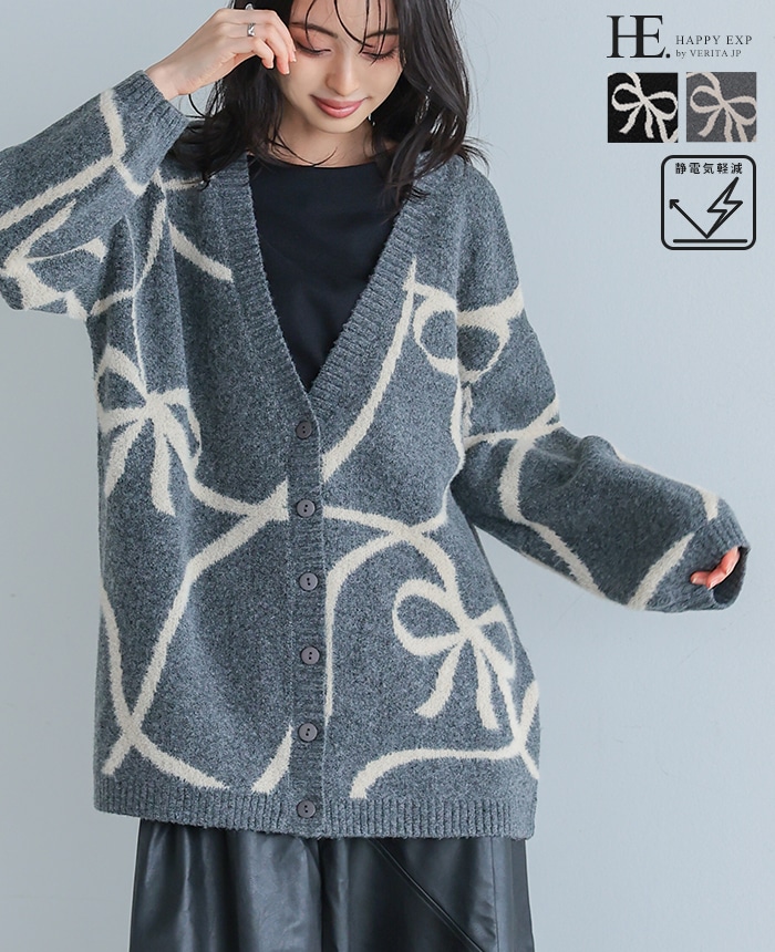 Happy急便 [NEW] リボン柄フェザーニットカーディガン 24798 2024秋冬新作 カーディガン