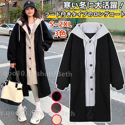 秋 冬寒い時期 フード付きタイプのロングコート アウター コート フード付き フェイクレイヤード ジャケット コート ゆったり アウター レディース