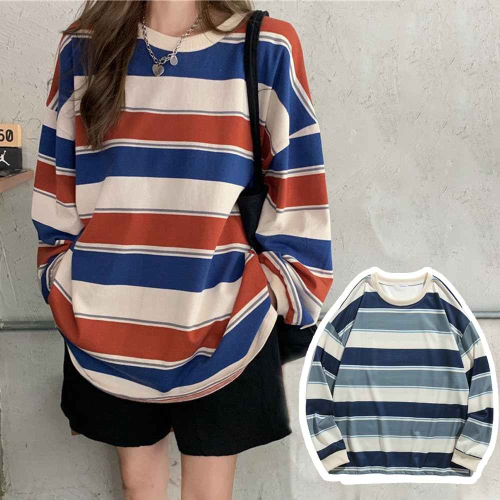 韓国ファッション 秋コーデ オーバー サイズ パーカー 長袖 レディース トップス ストライプ Tシャツ ロンt 韓国 長袖tシャツレディース ロングT