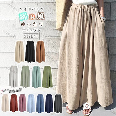 夏の定番 美脚リネンワイドパンツ 韓国ファッション リネンワイドパンツ レディース綿麻パンツワイドパンツロング ウエストゴム無地美脚カ