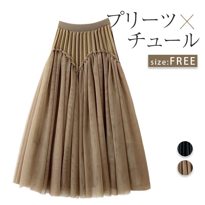 スカート レディース チュールスカート ロングスカート 春 夏 秋 冬 ロング プリーツ チュール ウエストゴム 異素材 切り替え ボトムス 上品 エレガント ふんわり ボリューム Aライン 体型カバ