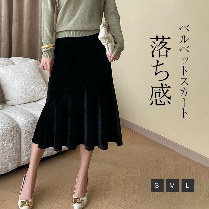 スカート レディース マーメイド ベロアスカート ベルベット 秋 冬 ボトムス 無地 ミモレ丈 ベロア ウエストゴム Aライン 着痩せ 光沢感 体型カバー おしゃれ ゆったり カジュアル かわいい エ