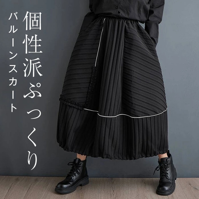 バルーンスカート レディース ロング スカート ボトムス ゆったり ロングスカート マキシスカート コクーンスカート ウエスト ゴム 切り替え ドッキング フリル 体型カバー 大人 デザイン 春秋 冬