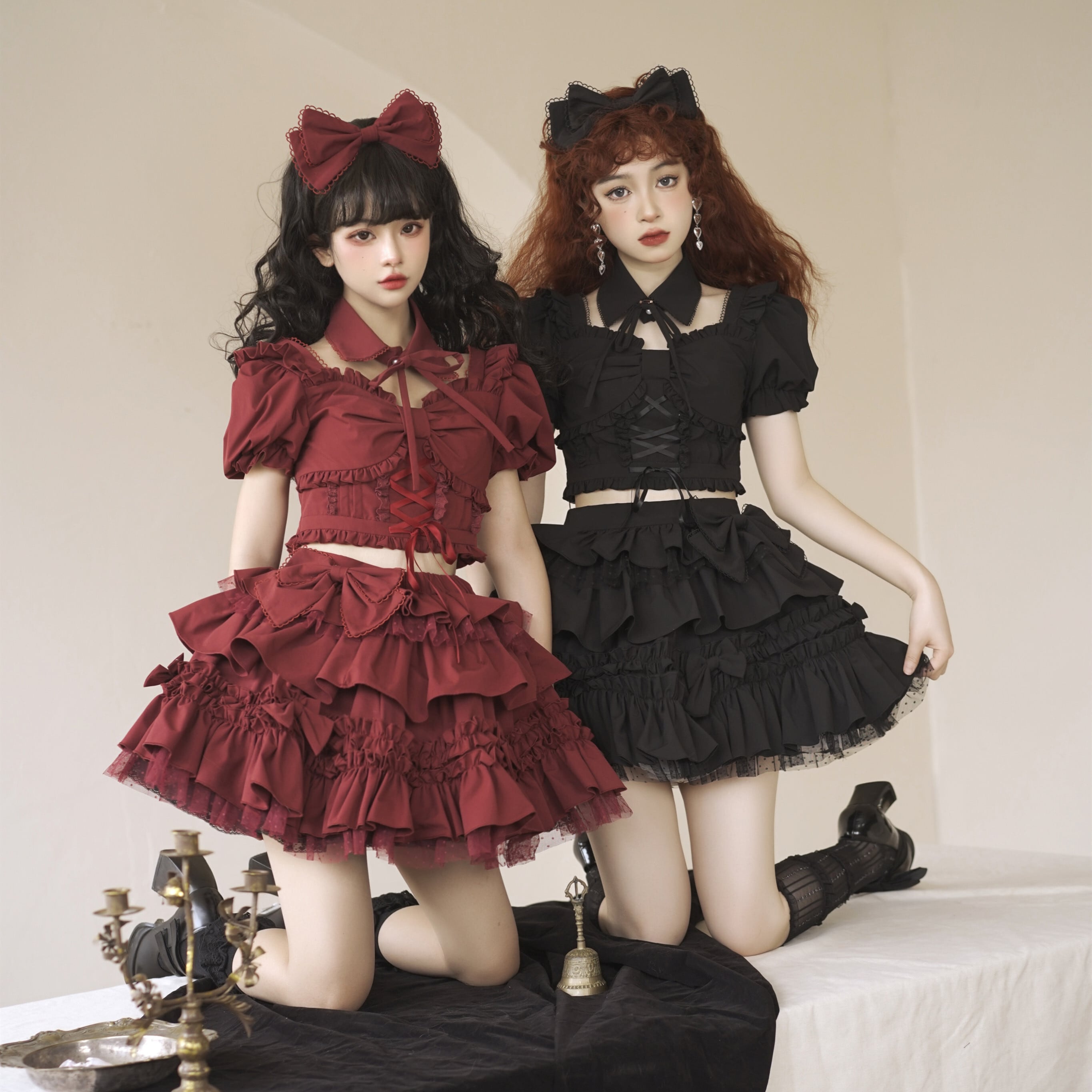 人気 可愛い リボン ギャル ロリータ レース 2色 トップス+スカート セットアップ
