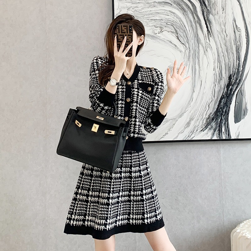 可愛いニットセーター上下二点セットアップ韓国ファッションレディース秋服2025人気新作長袖カーディガントップスチェックスカート セットアップ