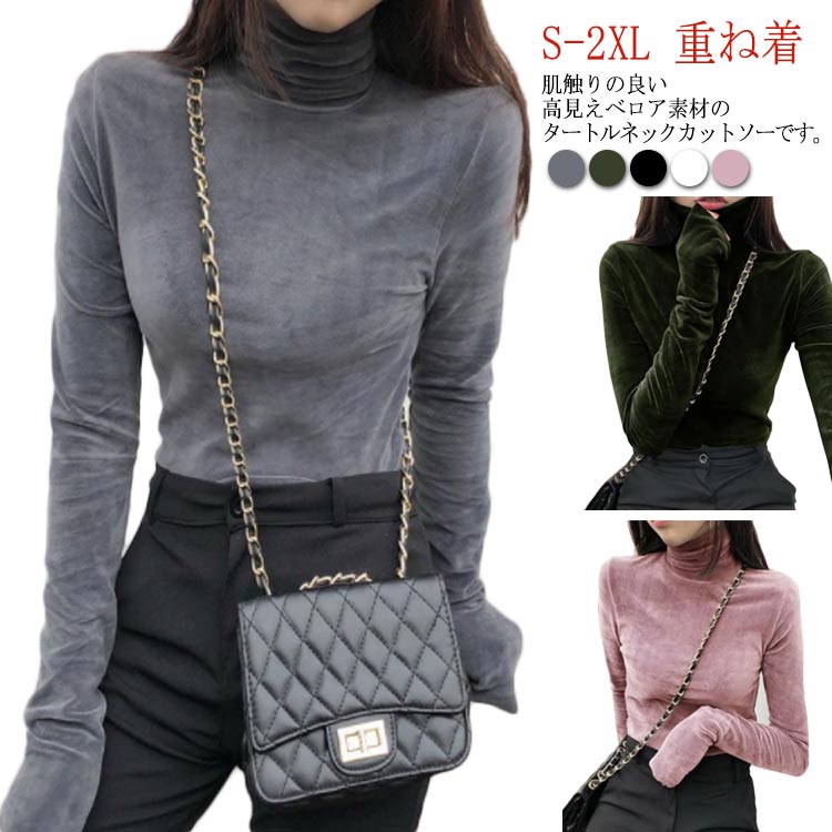 ハイネック カットソー ベロア プルオーバー トップス タートルネック 長袖 tシャツ インナー カットソー タイト ピンク ホワイト グレー ブラック おしゃれ シンプル 重ね着 タイト カジュアル