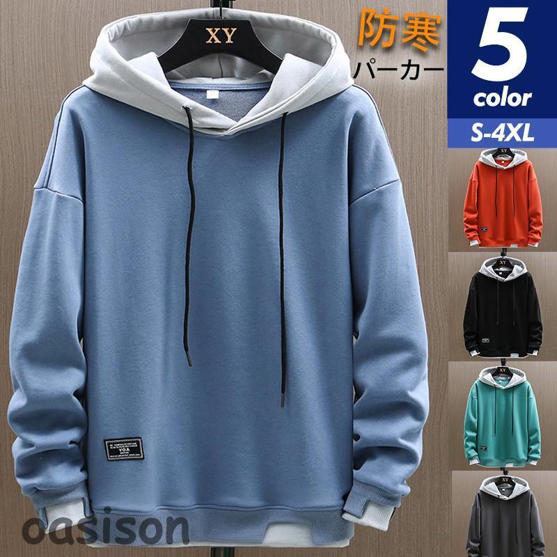 新入庫 パーカー メンズ アウター プルオーバー フェイクレイヤード スウェット トップス フード付き 長袖 ゆったり 秋冬 シンプル 無地 防風 かっこいい