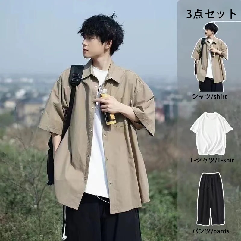 ハーフパンツ 2点セット 開襟 シャツ 半袖 通気性 セットアップ 上下セット 夏 おしゃれ カジュアル服 速乾 メンズ セットアップ