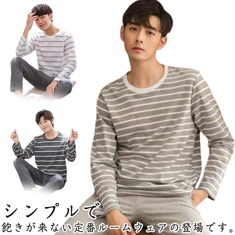 パジャマ ルームウェア メンズ 長袖 春 夏 薄手 Tシャツ 上下セット ボーダー ストライプ柄 グレー ネイビー スウェット 部屋着 大きいサイズ シンプル 上下 パンツ 長ズボン ペア お揃い 送