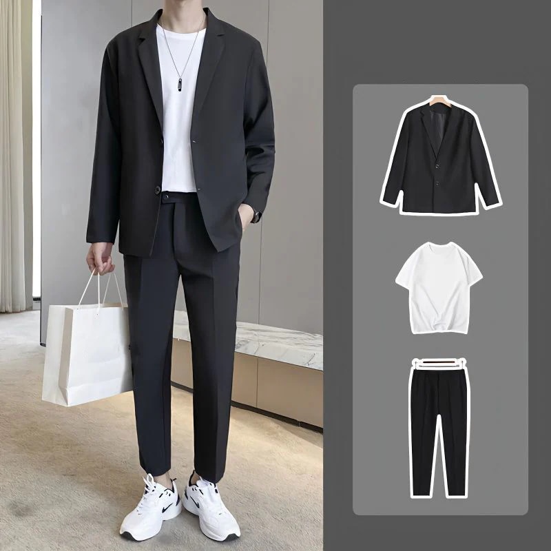 スーツ メンズファッション トレンド スーツジャケット+半袖tシャツ+ズボン セットアップ 上下 3点セット セットアップ