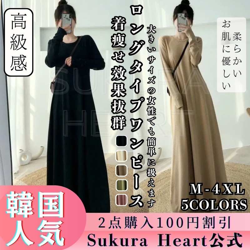 2025新入荷 韓国ファッション ワンピース 柔らかい お肌に優しい ロングワンピース さらさら 垂れ感 無地 気質 長袖 ニットワンピース ラウンドネック 大きいサイズ レディースファッション