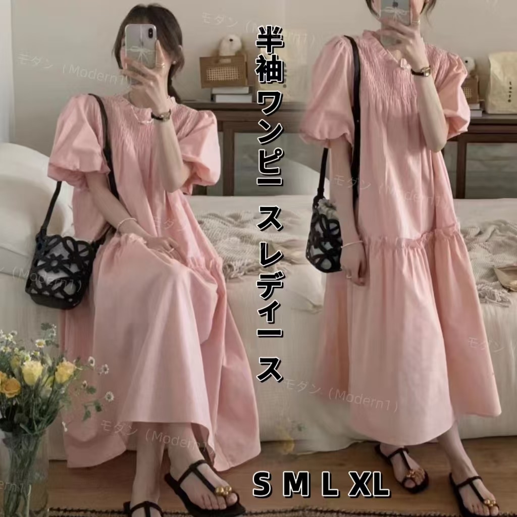 パフスリーブ ワンピース レディース 韓国 大人可愛い 夏ワンピ ピンク シンプル 半袖 おしゃれ かわいい リゾート 二次会 入学式 ワンピース きれいめ