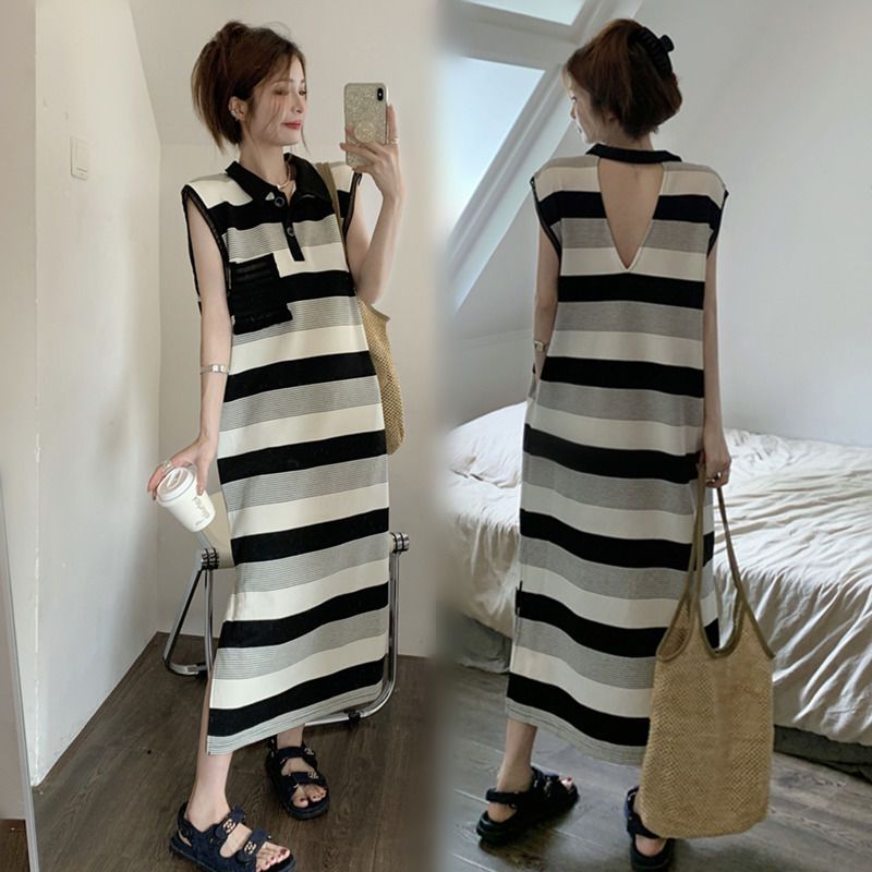 の準備ノースリーブ ニッチデザイン スリット ボーダー柄 ポロ ワンピース 大きいサイズ バックレス ゆったり おしゃれ 百掛け 半袖 凉しく ロング ワンピース ドレス