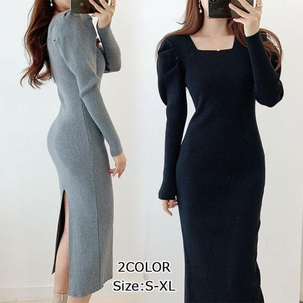 大人気 上品 ニットワンピース 長袖 エレガント パフスリーブ タイト あったか スリット入り 細見え かわいい おしゃれ 秋冬 通勤 OL 大人