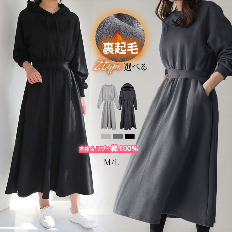 裏起毛 ワンピース パーカー パーカーワンピース レディース 秋冬 長袖 綿100% カジュアル トレーナー スウェット ウエストシェイプ Tシャツワンピ