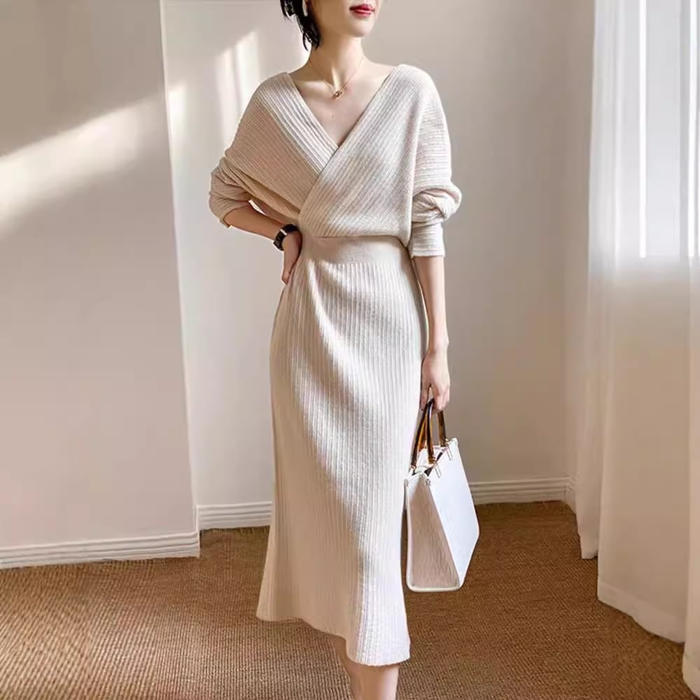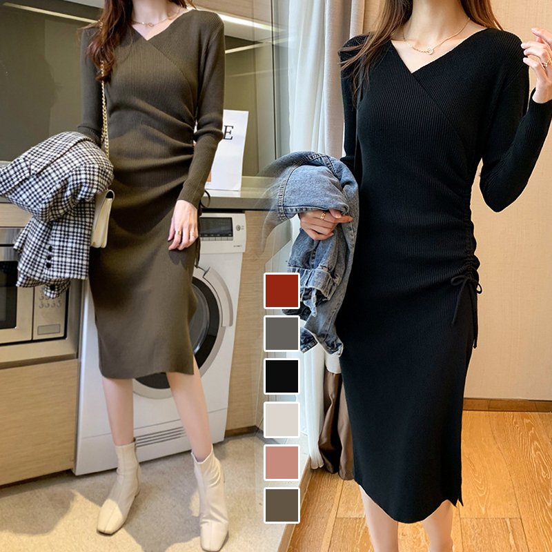 ニットワンピース レディース 長袖ワンピース Vネック 秋冬 新作 おしゃれ タイトニット スカート ロング オシャレ通勤 OL 大人 20代30代40代
