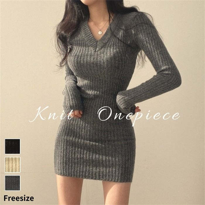 ニットワンピース ミニ丈 冬 秋冬 Vネック リブ セーター タイト 長袖 セクシー ワンピ ボディコン 秋冬 伸縮性 タイトワンピース シンプル ワンピ インナーワンピース オフィス 通勤 無地