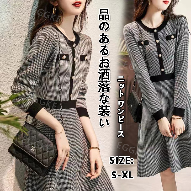 韓国系秋の新型 フランス式優雅 ファッション ウエスト 小香風千鳥格修身痩せニットワンピース女性 ニットワンピ