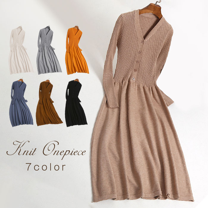 ニットワンピース 秋冬 大人 長袖 きれいめ ロング ニット ワンピース フレア タイトワンピース ニットロングワンピース Vネック 大人 おしゃれ 春 キャメル オフホワイト ブラ