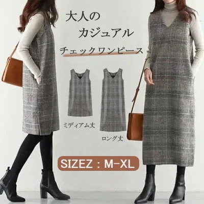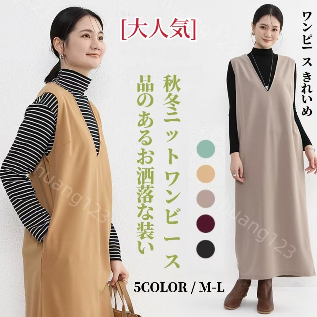 韓国ワンピース ワンピースレディース Vネックポケット 日系袖なしワンピース袖なし ゆったりロング丈 秋冬上品通勤せ快適きれいめ 袖なしミニ 膝丈ワンピ