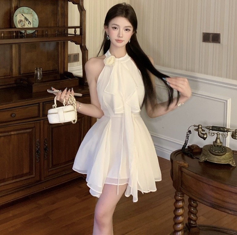 夏 ニューデザイン フランス パール ワンピース ウエスト引き締め ノースリーブ 着痩せ 高級感 ファッション 袖なしミニ 膝丈ワンピ