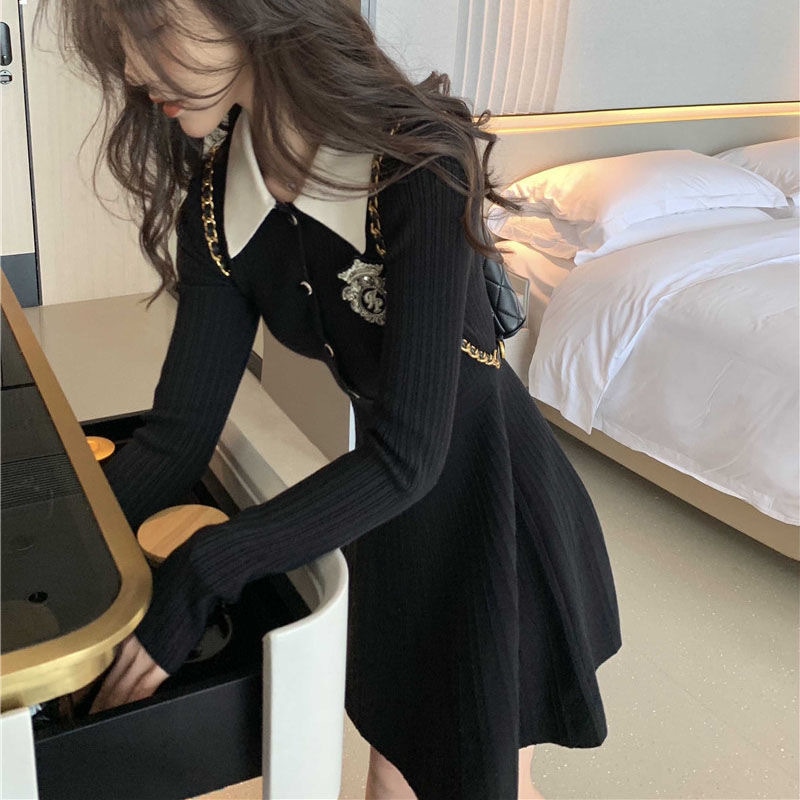 新作黒長袖ニットワンピース秋の小柄カレッジ風スレンダー着やせ気質スカート女装 長袖ロング マキシ丈ワンピ