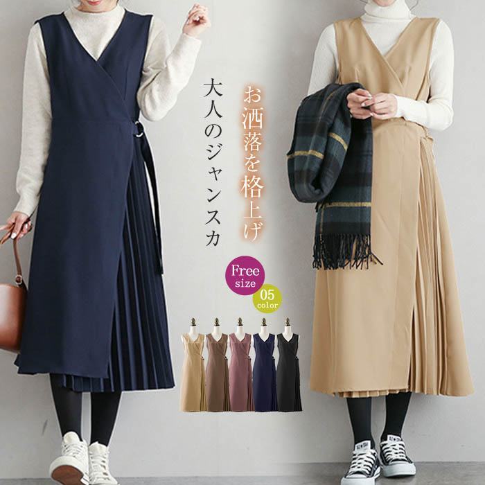 ジャンパースカート 秋 冬 ジャンスカ ワンピース Vネック 無袖 ベストワンピース 膝下 レディース ロング丈ジャンパースカート 秋 冬 シンプル カジュアル プリーツ レイヤード きれいめ お洒落