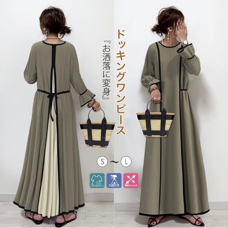 韓国ワンピース 日系袖なしワンピース袖なし通勤格ロングワンピース レディース切り替え 体型 カバー オフィス 通勤 長袖ロング マキシ丈ワンピ