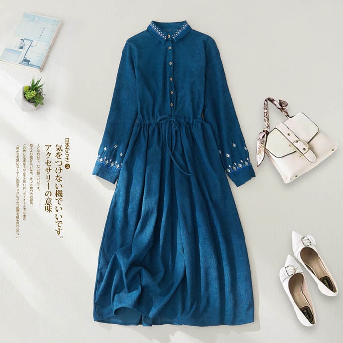 ワンピース 春 秋 レディース 刺繡 コーデュロイ Aライン ティアード ワンピース ロング丈 長袖 ロング丈ワンピ 体型カバー 大きいサイズ シンプル カジュアル ビックシルエット ゆったり トレン