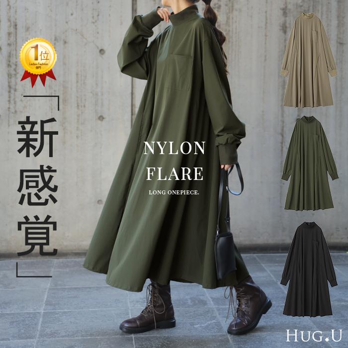 ワンピース ロング ワンピ ナイロン ハイネック 長袖 ロングワンピース 体型カバー レディース アウトドア 長袖ロング マキシ丈ワンピ