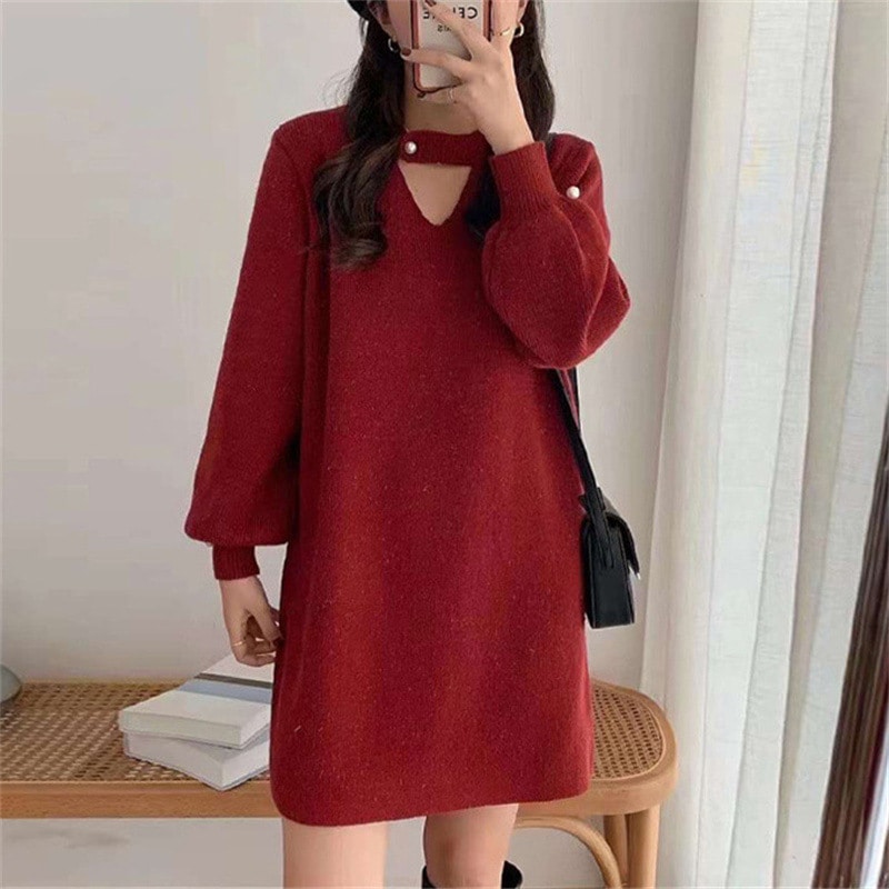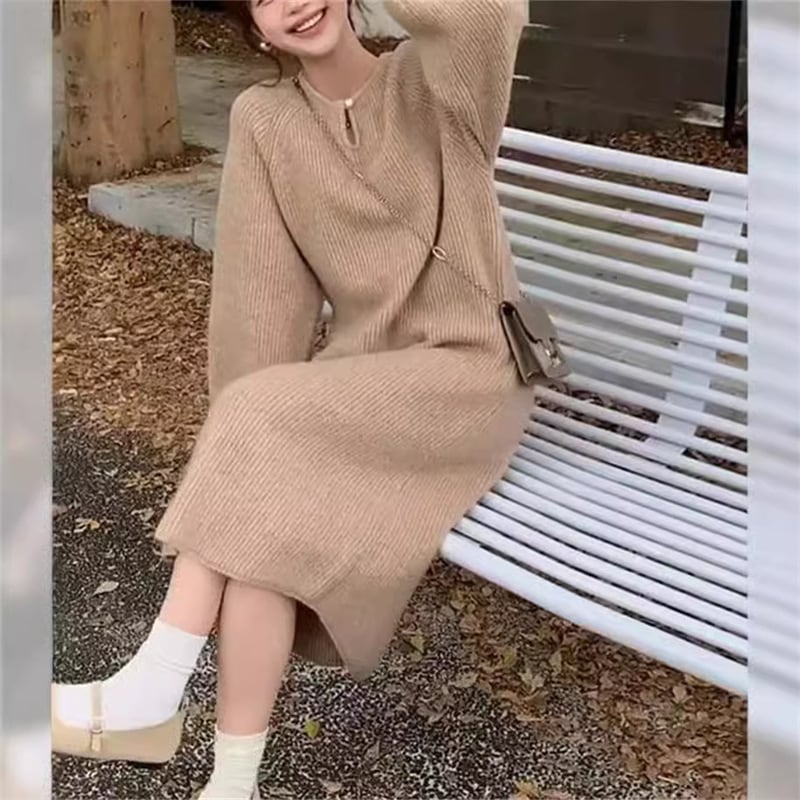 大きいサイズの婦人服ゆったりだるい風やせて見える秋冬の新作ニット長袖ロング丈ボトムセータースカートブーム 長袖ロング マキシ丈ワンピ