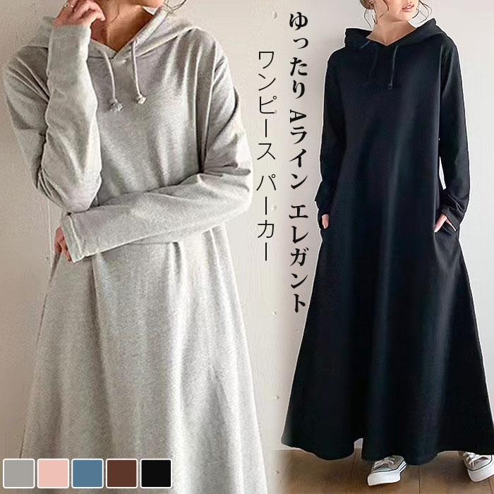 パーカーワンピース ワンピース レディース ロング 長袖 秋冬 プルオーバー カジュアル 膝下丈 マキシ丈 フード付き ゆったり 体型カバー あったか 暖か 防寒 ロングワンピ きれいめ フレア 大き