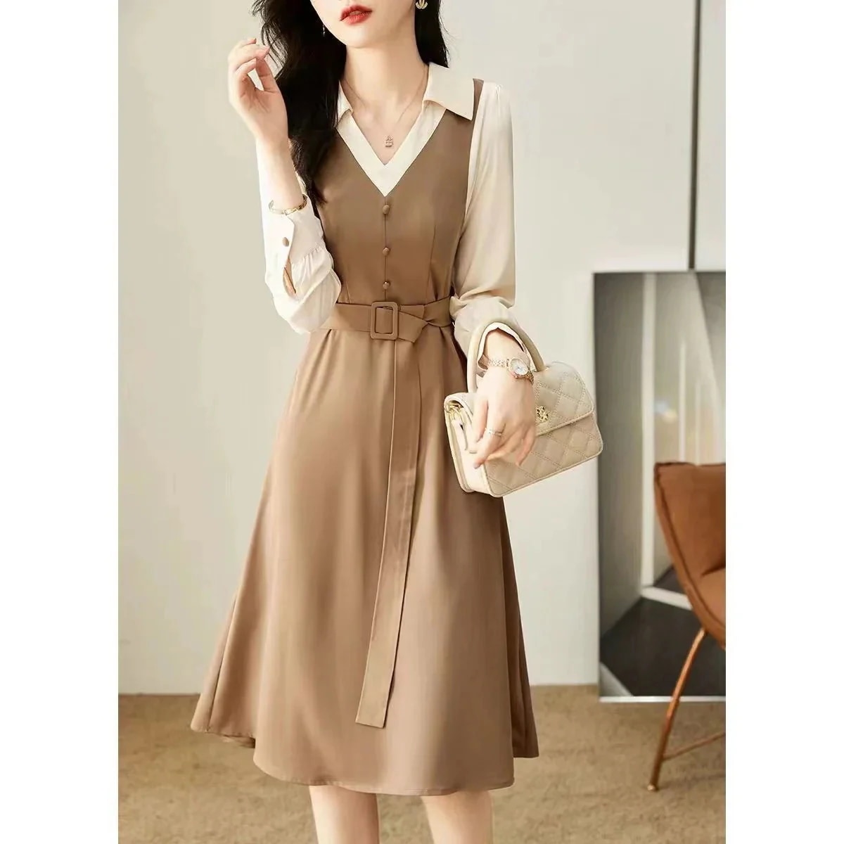 ワンピース レディース Vネック 長袖 秋冬 ロングワンピース きれいめ ワンピース ドッキングスカート 通勤 韓国 セクシー 新作 着痩せ
